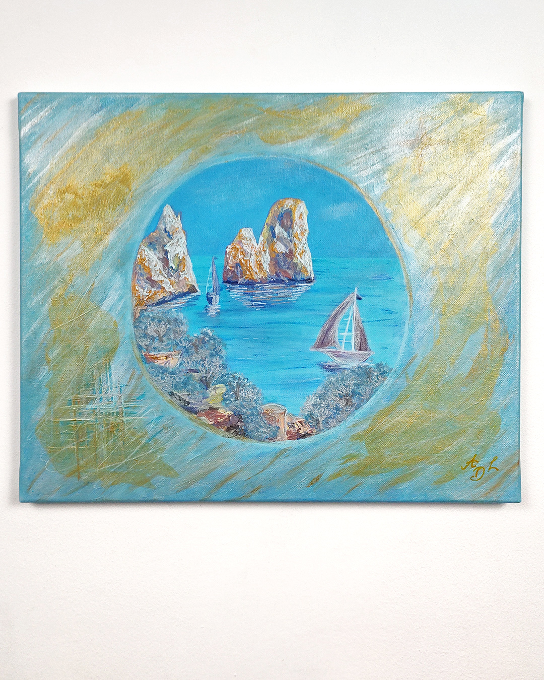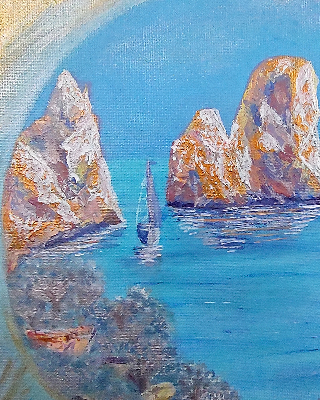 The true heart of the painting is the remaining presence of beautiful summer memories. It’s a tribute not just to one of the world’s most beautiful islands, but to the deep, satisfying calm that descends when all is perfect, and the belief that such moments, once held, can illuminate everything that comes after. It is the story of a golden, intense summer memory, eternally radiating from the canvas.