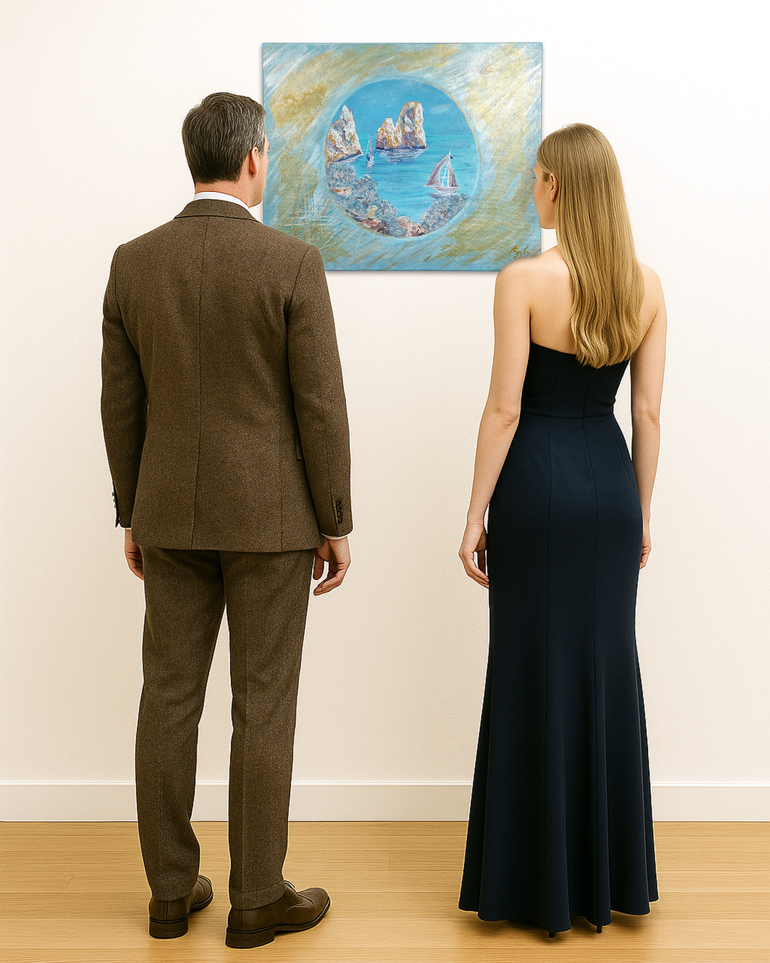 The day the artist captured this scene was one of those perfect, distilled Mediterranean moments that live forever in the memory. It was high summer on Capri, and the air was thick with the scent of salt and sun-warmed stone.